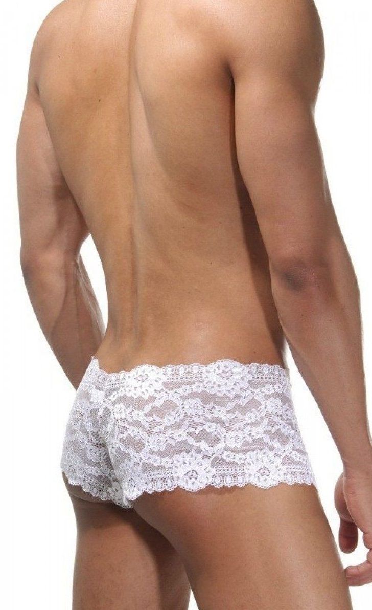 Мужское кружевное белье из мягкой и эластичной ткани белого цвета. Трусы плотно прилегают к телу, но при этом не доставляют никакого дискомфорта. Прекрасно украсят и дополнят любой образ и так же отлично смотрятся в одиночку.