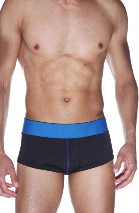 Мужские хипсы из эластичной черной ткани, с синими строчками и широким синим поясом.