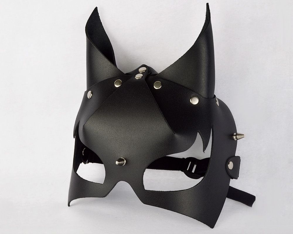 Маска изготовлена из натуральной кожи и имеет объемную форму. Регулируется при помощи резинки и пластиковой пряжки. Металлическая фурнитура имеет никелевое покрытие.