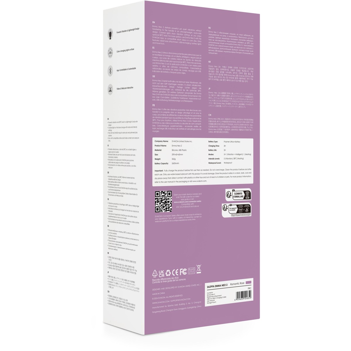 Ищете что-то, что преобразит ваши ощущения? Emma Neo 2 — это мощный и интерактивный wand-вибратор, который объединяет инновационные технологии и эргономичный дизайн, чтобы подарить вам удовольствие нового уровня. Глубокие, мощные вибрации. Они проникают глубже поверхностных ощущений и дарят невероятное наслаждение. Управление через приложение. Настраивайте вибрации, играйте на расстоянии или синхронизируйтесь с эротическими видео и музыкальными ритмами через приложение SVAKOM. Головка вибратора нагревается до комфортных 38°C, создавая ощущение естественного тепла. 5 виброрежимов, 5 уровней интенсивности и режим SVAKOM, имитирующий ритмы секса, позволяют настроить устройство под любые предпочтения. Превратите ваш wand в игрушку для точечной стимуляции или парной игры: насадка с ушками идеально подходит для клитора, сосков, члена, промежности и других эрогенных зон. Изменение цвета подсветки позволяет легко ориентироваться в режимах и добавляет визуального удовольствия.