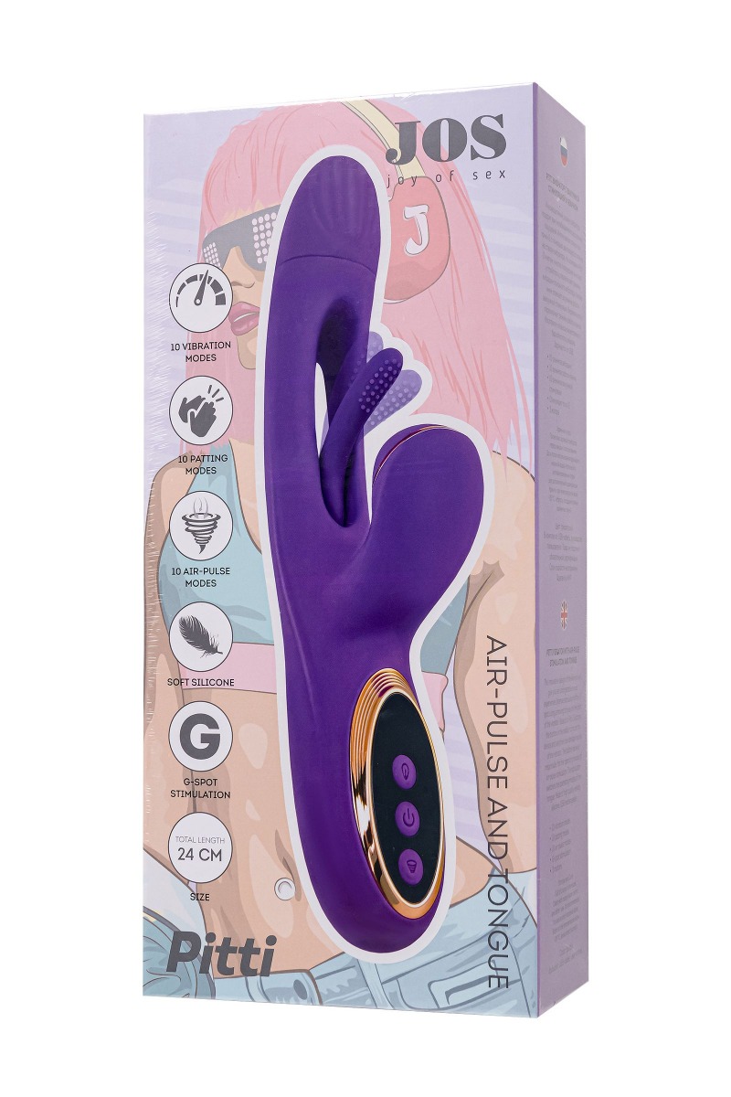Погрузитесь в мир инновационных ощущений с вибратором Pitti от самого необыкновенного бренда JOS! Этот невероятный технологичный дизайн поднимет стимуляцию точки G на абсолютно новый уровень. Двигающийся язычок внутри вагинальной части точечно вибрирует непосредственно на зоне G, погружая вас в водоворот удовольствия. А клиторальный отросток в это время может ласкать вас вакуумными волнами воздушной пульсации. Тройное удовольствие гарантирует оргазм с максимальным уровнем экстаза. Управляйте своим наслаждением с легкостью! Три кнопки на основании вибратора контролируют каждый аспект удовольствия. Серединная кнопка включает устройство и переключает режимы основного вибратора. Кнопки ниже управляют режимами клиторального отростка. Верхняя кнопка изменяет режимы работы язычка. Pitti выполнен из высококачественного бархатистого силикона, обеспечивая максимальный комфорт. Заряжается от USB, что делает использование еще более удобным. Простое управление тремя кнопками гарантирует, что каждая функция будет под вашим контролем. Дизайн игрушки выполнен в насыщенном фиолетовом цвете с золотыми вставками. Изготовленный из высококачественного бархатистого силикона, Pitti легко заряжается от USB, что делает его современным и практичным в использовании. Идеально гладкое и безопасное покрытие обеспечит вашей коже комфорт. Рабочая длина - 13,5 см.